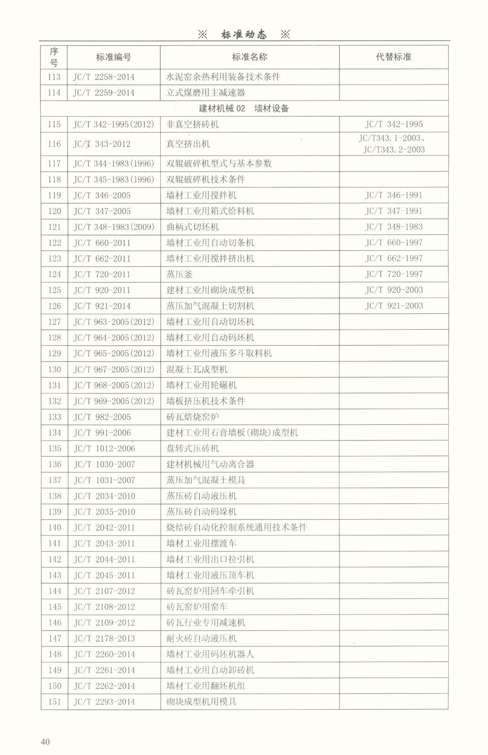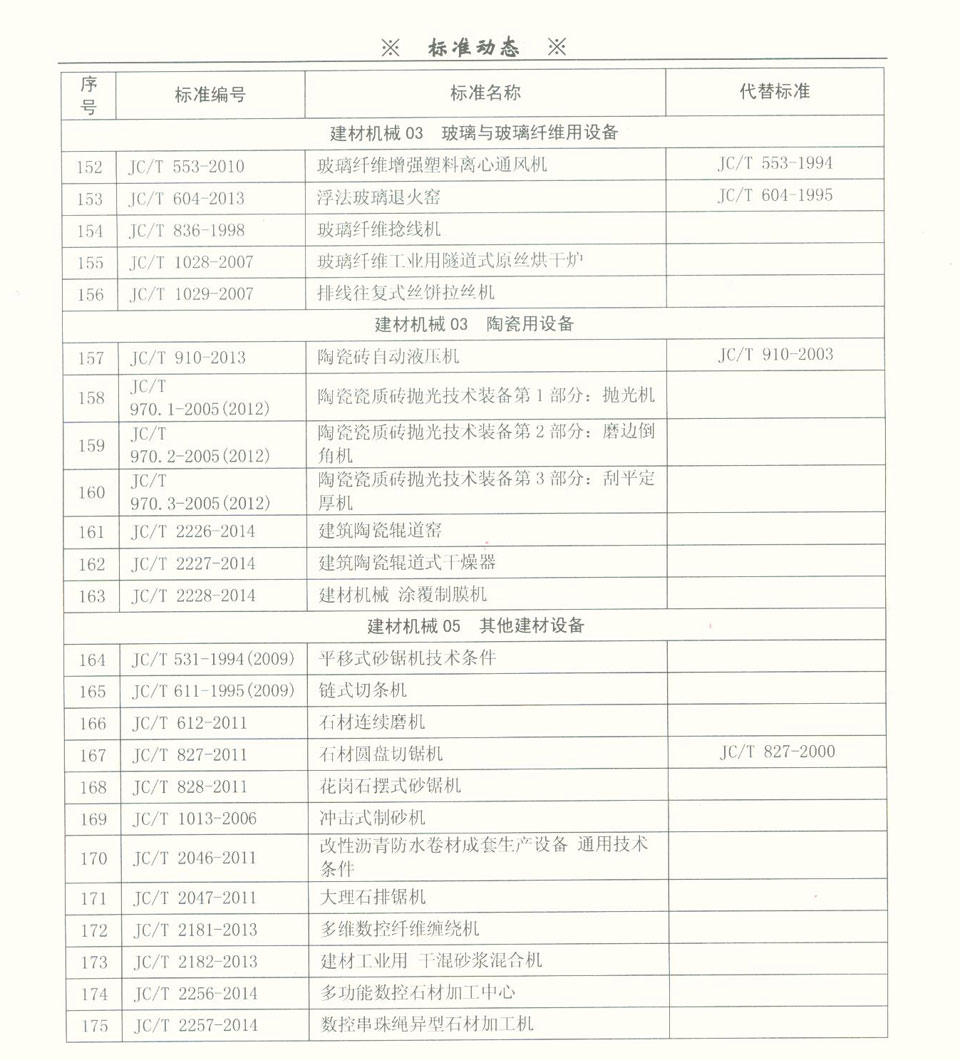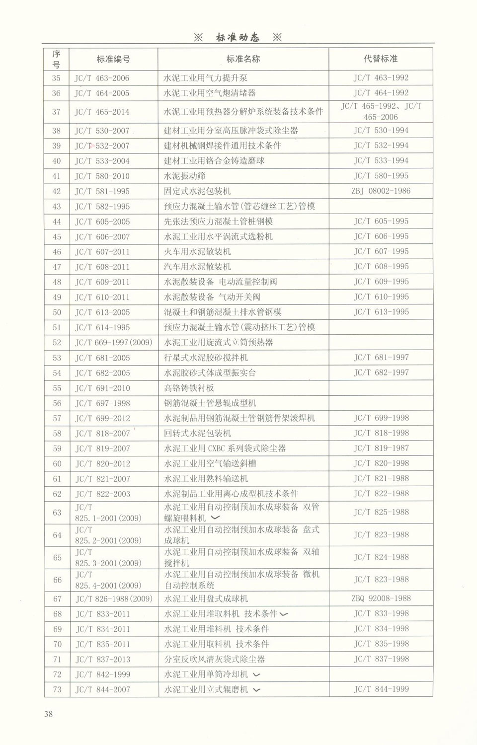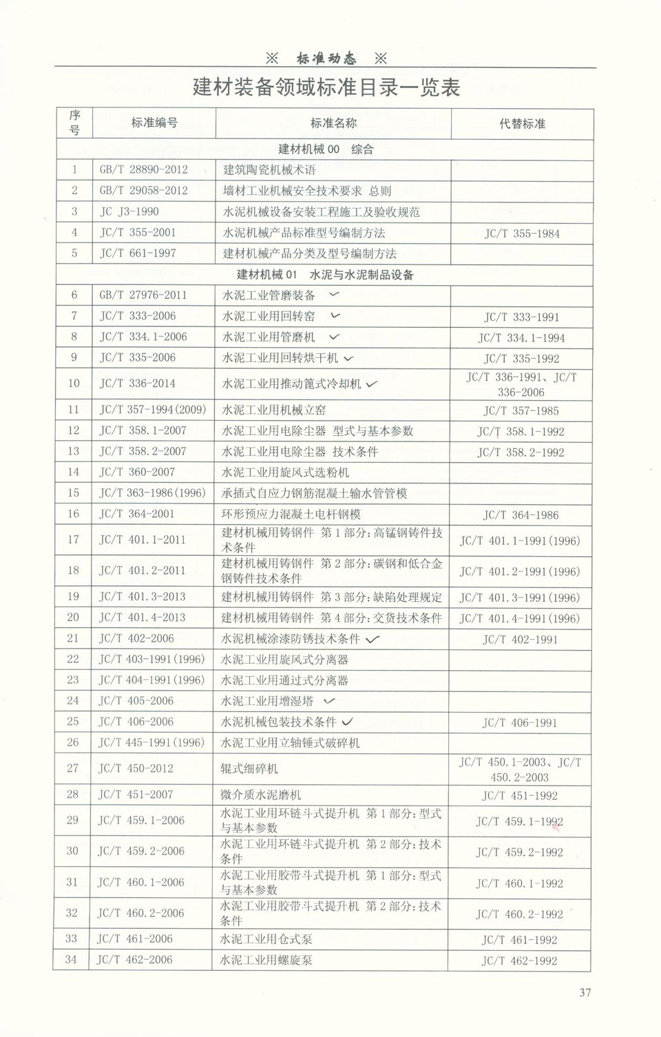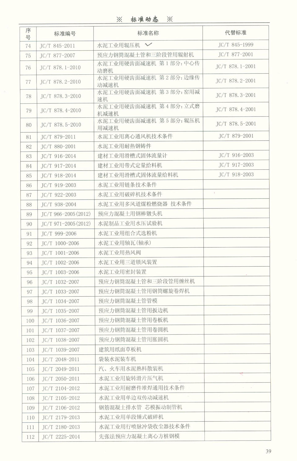 江蘇鵬飛集團著眼于國內(nèi)建材機械新技術、新產(chǎn)品、新工藝、新材料的技術領域,普及和提高標準化意識,強化新標準的宣貫工作,提高對標準化工作的感知、重視程度,全面提高行業(yè)各類標準的覆蓋率,創(chuàng)造更加良好的標準化工作發(fā)展空間。公司在企業(yè)內(nèi)部制定并實施了技術標準、管理標準和工作標準并有效組織推進實施,先后參與國家建材機械標準化技術委員會組織的GB/T27976-2011水泥工業(yè)管磨裝備、JC/T 333-2006 水泥工業(yè)用回轉窯、JC/T 334.1-2006水泥工業(yè)用管磨機、JC/T335-2006 水泥工業(yè)用回轉烘干機、JC/T 336-2014 水泥工業(yè)用推動篦式冷卻機、JC/T 402-2006 水泥機械涂漆防銹技術條件、JC/T 825.1-2001(2009) 水泥工業(yè)用自動控制預加水成球裝備 雙管螺旋喂料機、 JC/T 833-2011 水泥工業(yè)用堆取料機 技術條件 JC/T 842-1999 水泥工業(yè)用單筒冷卻機、JC/T 844-2007 水泥工業(yè)用立式輥磨機、JC/T845-2011水泥工業(yè)用輥壓機、JC/T401-2011建材機械用鑄鋼件技術條件、JC/T999-2006水泥工業(yè)用組合式選粉機、JC/T406-2006水泥機械包裝技術條件、JC/T405-2006水泥工業(yè)用增濕塔等15項產(chǎn)品標準起草工作.