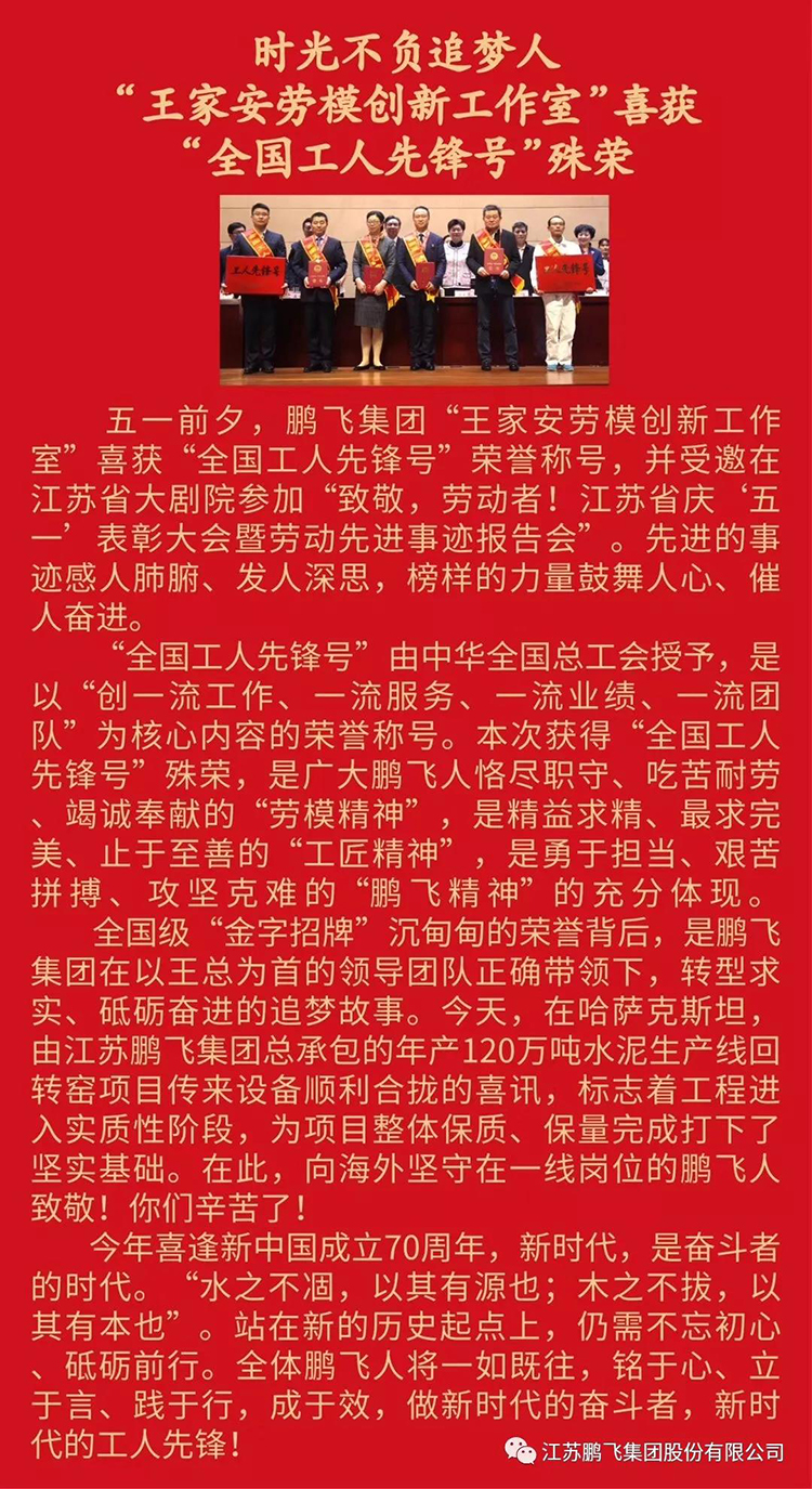 鵬飛王家安勞模創新工作室喜獲全國工人先鋒號