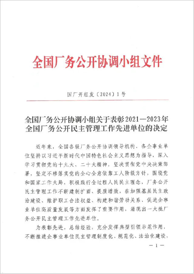 近日,全國廠務公開協調小組印發《關于表彰2021-2023年全國廠務公開民主管理工作先進單位的決定》,江蘇鵬飛集團股份有限公司被表彰為全國廠務公開民主管理工作先進單位。