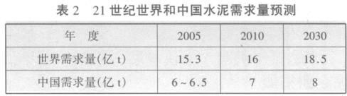 21世紀世界和我國水泥的生產與消費仍將保持一定速度增長,但不是很高。表 2 是世界和中國水泥需求量的預測。