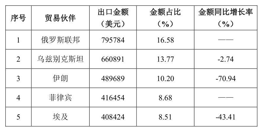 表2 2021年水泥回轉窯主要出口國家或地區情況