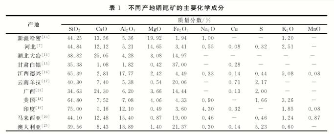 銅尾礦的化學組成非常復雜,不同產地的銅尾礦之間可比較性差,這是銅礦石成礦地質、礦石開采方法、選礦工藝以及銅尾礦堆存方式等差異所致。組成銅尾礦的主要元素有 Mg、Al、Si、S、Ca、Fe、Cu 等,且 伴 有 Mn、Ti、Zn、Sr等 微 量 元素。不同產地銅尾礦的主要化學成分見表1。