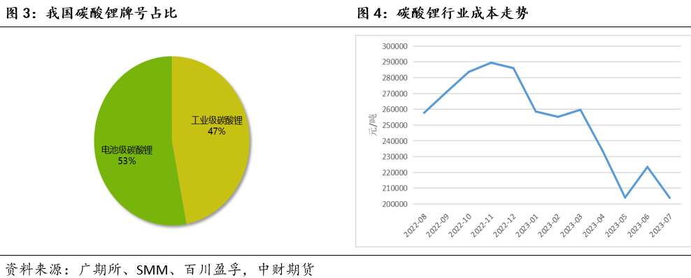 2、需求方面(1)廣東省作為國內3C電子商品制造消費大區,其鋰電池產業基礎雄厚,擁有最完善的鋰電池產業鏈,涵蓋了從上游金屬礦產資源、電池材料,到中游電芯制造及PACK組裝,再到下游鋰電池應用及電池回收利用的全產業鏈。(2)碳酸鋰的主要終端消費為新能源產業(電動汽車、儲能)及3C消費類電池。根據市場反饋,2023年6月我國新能源汽車產銷分別完成78.4萬輛和80.6萬輛,同比分別增長32.8%和35.2%,市場占有率達到30.7%。6月我國動力電池產量共計60.1GWh,同比增長45.7%,環比增長6.3%。其中三元電池產量17.7GWh,占總產量29.4%,同比下降4.2%,環比下降4.9%;磷酸鐵鋰電池產量42.2GWh,占總產量70.3%,同比增長86.3%,環比增長11.7%。6月,我國動力電池銷量共計52.2GWh,同比增長9.9%。其中三元電池銷量18.4GWh,占總銷量35.2%,同比下降16.8%;磷酸鐵鋰電池銷量33.7GWh,占總銷量64.5%,同比增長33.0%。6月,我國動力電池裝車量32.9GWh,同比增長21.8%,環比增長16.5%。其中三元電池裝車量10.1GWh,占總裝車量30.6%,同比下降13%,環比增長11.6%;磷酸鐵鋰電池裝車量22.7GWh,占總裝車量69.1%,同比增長47.5%,環比增長18.7%。(3)今年5月中旬開始,儲能市場需求逐漸向好,磷酸鐵鋰市場開工率上漲,帶動了碳酸鋰的需求量,預計下半年儲能市場需求增量顯著。進入7月份以后,隨著3C數碼市場出口貿易的訂單逐步完結,需求又恢復平淡。動力市場活躍度雖有增強,但還未完全恢復,終端的汽車動力電池需求量仍較為有限。正極材料企業多有備貨,碳酸鋰高價向下傳導困難,放緩了備貨節奏,觀望市場走勢,采購較為謹慎。(4)下游企業基本采用隨行就市的報價模式,根據原材料價格來擬定交易合同。開工率受訂單影響,上半年動力市場訂單狀況不佳,總體較去年沒有穩定增長;3C消費端海外訂單增量明顯,進出口貿易狀況良好;儲能市場逐步增量,但訂單、需求、價格等向上傳導仍需時間,目前碳酸鋰的需求端情況仍較弱。(5)今年碳酸鋰價格大幅下跌,上游貿易商違約率不高。國內訂單在市場價格波動劇烈的影響下,視價格行情分成兩種情況,原材料價格上漲時,上游企業較為強勢,原材料價格下跌時,下游較為強勢,會取消原有訂單報價,簽署新訂單。出口的貿易訂單極少違約,且因今年碳酸鋰價格回落的緣故,今年新開工生產的銷售利潤率較高。(6)目前下游的供應和銷售情況皆平穩,原料庫存一般維持在2周左右。