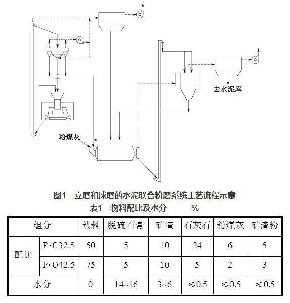 淶水冀東水泥有限公司3個水泥粉磨系統(tǒng)均采用JLMS-24.3立磨與Φ4.8m×9.5m球磨機(jī)組成聯(lián)合粉磨系統(tǒng)。JLMS-24.3立磨裝機(jī)功率2240kW,磨盤中徑2400mm,3個磨輥,磨盤轉(zhuǎn)速33.58r/min,產(chǎn)量210t/h,入料粒度≤30mm;配套選粉機(jī)JXF4100GY,成品量180~220t/h,比表面積≥200m2/kg,最大喂料量600t/h,通過氣體溫度≤150℃,通風(fēng)量(70~90℃)180000m3/h;球磨機(jī)Φ4.8m×9.5m,裝機(jī)功率3550kW,產(chǎn)量180t/h,生產(chǎn)P·O42.5水泥時,比表面積360~380 m2/kg;配套O-Sepa選粉機(jī),通風(fēng)量240000m3/h,最大通過量720t/h。水泥粉磨系統(tǒng)工藝流程見圖1,系統(tǒng)設(shè)計指標(biāo):生產(chǎn)P·O42.5水泥,臺時產(chǎn)量180t/h,分步電耗35.5kWh/t,比表面積360m2/kg,生產(chǎn)P·C32.5水泥,臺時產(chǎn)量240t/h,分步電耗26.6kWh/t,比表面積370m2/kg。物料配比及相應(yīng)的水分情況見表1。