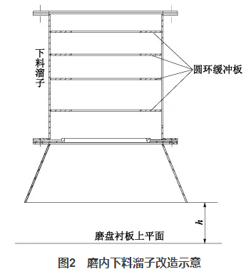 一方面它降低了入磨物料高落差對溜子的沖刷,另一方面圓環(huán)的收口作用使得物料的下料點發(fā)生了變化,將原先的單點偏心下料改成接近中心下料,改善了物料在磨盤上的偏離現(xiàn)象。同時,適當(dāng)調(diào)整h值的大?。ㄔO(shè)計600mm,最終改為400mm),使得下料波動時,可以起到一定的緩沖作用,穩(wěn)定料床。