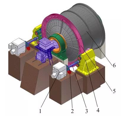 1. 同步電動機 2. 制動器 3. 力矩限制聯軸器 4. 多點嚙合減速器 5. 齒圈 6. 磨機本體