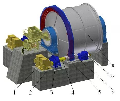 1. 異步電動機 2. 高速聯軸器 3. 雙輸入行星減速器 4. 齒式聯軸器 5. 開式齒輪軸組 6. 齒圈 7. 慢速驅動裝置 8. 磨機本體