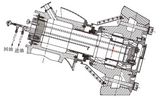磨輥軸承潤滑是通過集中潤滑系統來實現的,通過稀油站向磨輥內部供油,油品為460#極壓工業齒輪油。磨輥裝置結構及潤滑油走向如圖1所示。