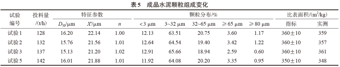 關閉和開啟不同格數的分料閥進行生產,分別標定磨機產量,并對粉磨過程中各點物料進行取樣,測定物料顆粒組成及物理性能、與外加劑相容性。然后對加工過程中各點物料粒度變化情況進行比較后進行質量指標的調整(試驗5)。