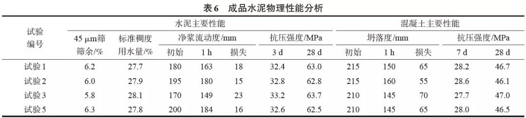 成品水泥顆粒組成變化分析見表5,成品水泥物理性能變化見表6。其中,(1)水泥凈漿流動度和混凝土坍落度試驗中減水劑均使用JY公司生產的PS-1型聚羧酸減水劑;(2)水泥凈漿流動度試驗依照GB/T 8077—2012《混凝土外加劑勻質性試驗方法》進行,減水劑摻入量為水泥質量的0.8%;(3)混凝土強度等級為C30,依照JGJ 55—2011《普通混凝土配合比設計規程》進行的相同配合比設計,減水劑摻入量為膠凝材料質量(水泥、粉煤灰和礦粉)的2.0%,膠凝材料和骨料均為同一進廠批次,坍落度試驗依照GB/T 50080—2016《普通混凝土拌合物性能試驗方法標準》進行。