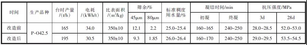 表3 改造前后各項(xiàng)指標(biāo)及水泥性能