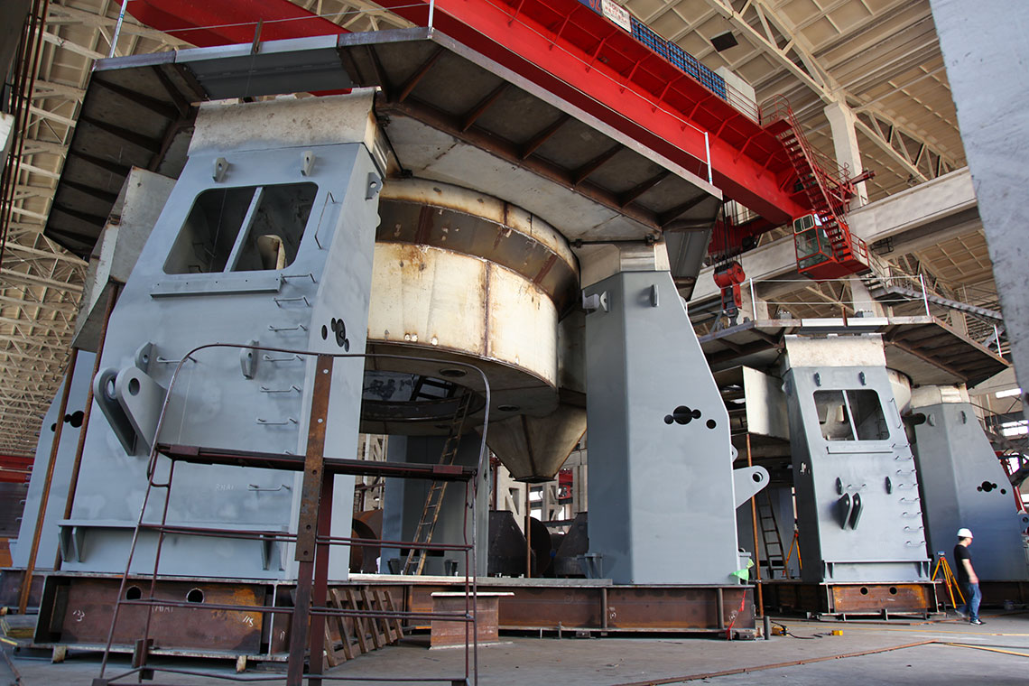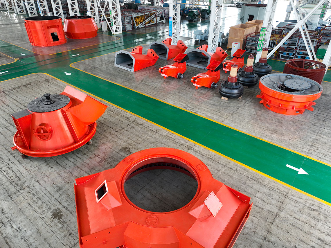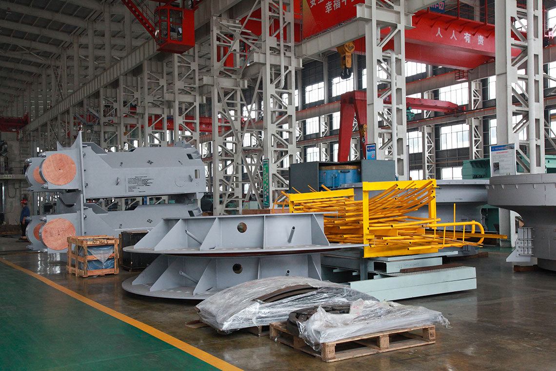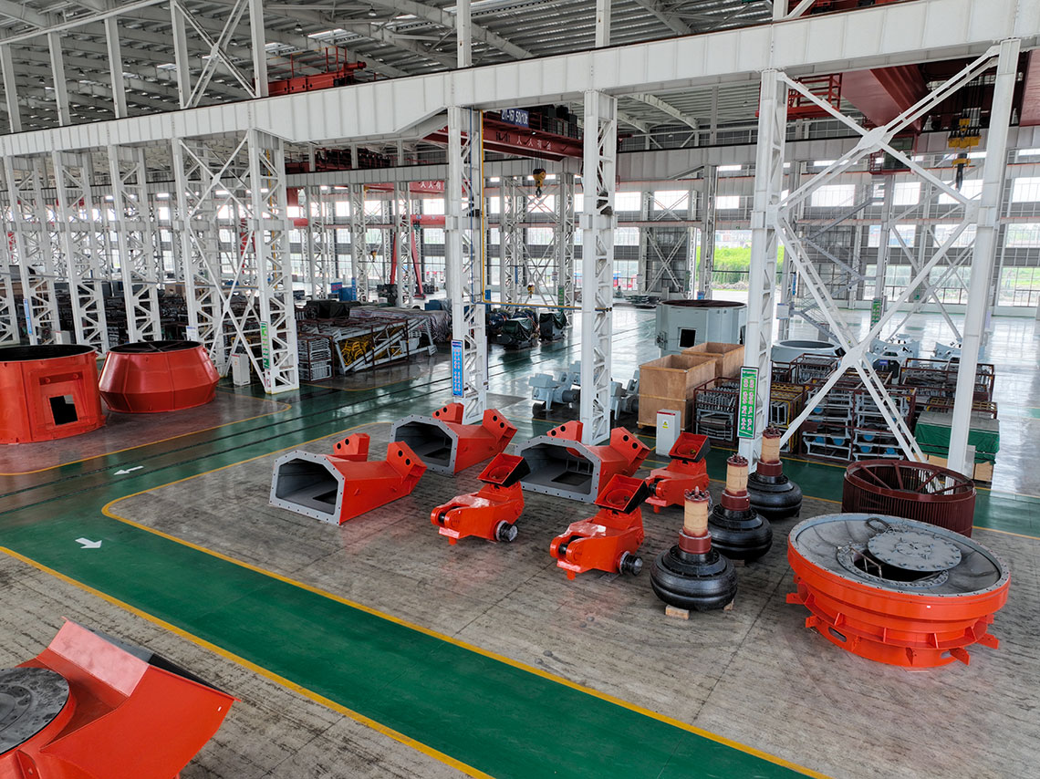 磨煤機(jī)三個磨輥由旋轉(zhuǎn)的磨盤帶動進(jìn)行碾磨作業(yè)。入磨物料經(jīng)中心落煤管落在磨盤上后,由旋轉(zhuǎn)磨盤產(chǎn)生的離心力將其輸送至碾磨輥道上碾磨。碾磨壓力由彈簧或液壓加壓裝置產(chǎn)生,通過靜定的三點(diǎn)系統(tǒng),碾磨力均勻地傳至三個磨輥,通過加壓系統(tǒng)壓力傳至基礎(chǔ)。煤粉的干燥和輸送利用熱風(fēng)來進(jìn)行。熱風(fēng)通過噴嘴環(huán)均勻分布于磨盤四周,將經(jīng)碾磨的物料干燥并輸送至磨機(jī)上部的分離器。物料的粗細(xì)粉在此分離,細(xì)粉排出磨機(jī),粗粉重新返回磨內(nèi)碾磨。物料中的一些不可破碎物可通過磨機(jī)下部的排碴口排出。磨煤機(jī)主要由基礎(chǔ)部,減速機(jī),下架機(jī),中架機(jī),磨盤,磨輥,加壓裝置,分離器,正壓風(fēng)密封裝置,蒸汽吹掃裝置等部件組成,還配有主電動機(jī),潤滑油站,液壓站和密封風(fēng)機(jī)等附屬設(shè)備,另備有慢速傳動裝置,安裝檢修專用工具,扶梯平臺,煤粉分配器,速斷閥等配套設(shè)備供用戶選用。磨煤機(jī)采用液壓加壓系統(tǒng),在運(yùn)行中即可對粉磨壓力進(jìn)行調(diào)整,并具有更好的過鐵保護(hù)性能。在原標(biāo)準(zhǔn)型的基礎(chǔ)上增加了磨輥翻出裝置,并提高了磨體的抗爆能力。